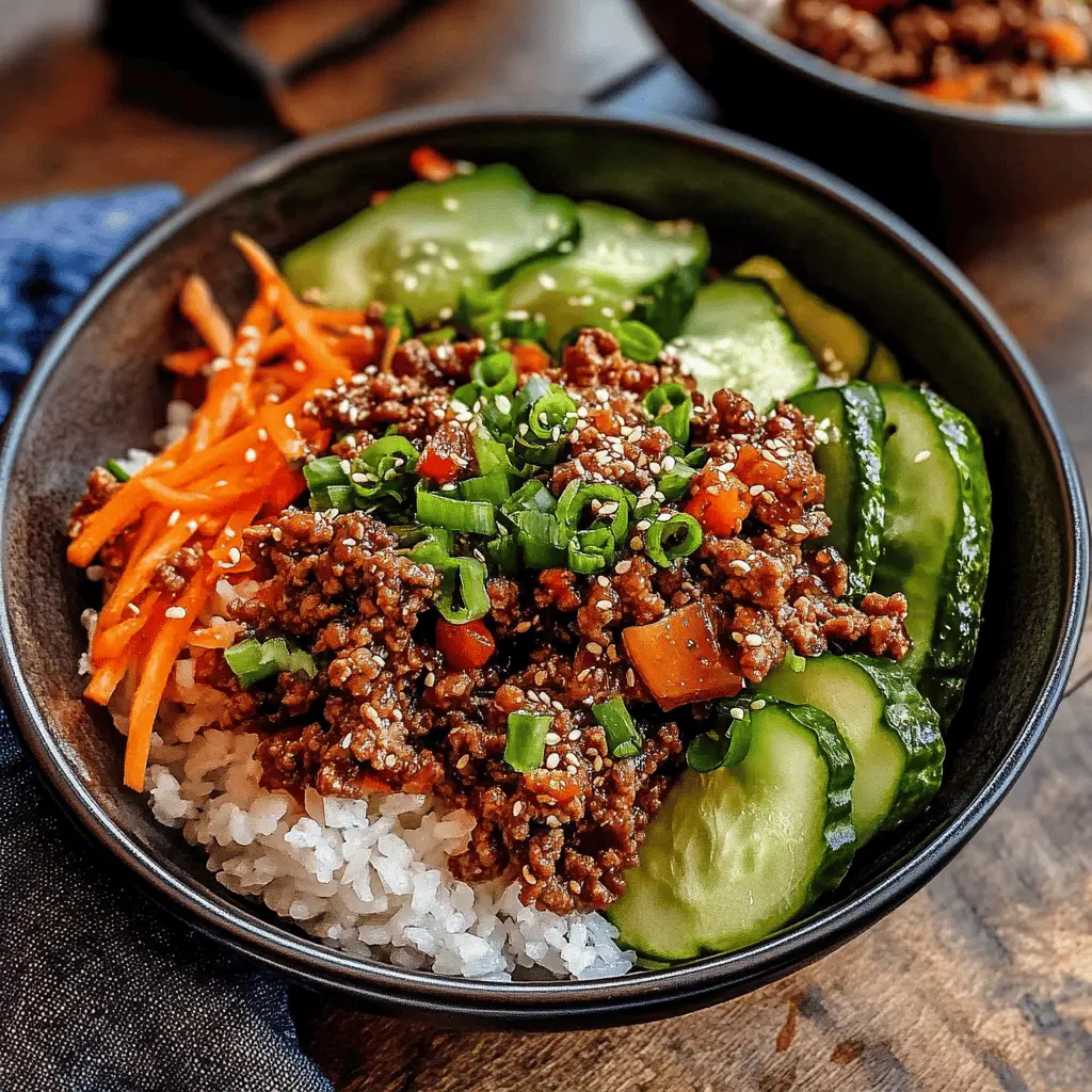 While the beef is cooking, get your serving bowls ready. Place a scoop of cooked rice in each bowl as the base. Then, top the rice with the cooked ground beef bulgogi. Next, arrange the lettuce leaves, cucumber slices, and shredded carrots around the beef in each bowl, making it look colorful and fresh. Finally, sprinkle some extra sesame seeds and chopped green onions on top for a nice touch. Serve with kimchi on the side if you like it spicy, and enjoy your delicious Ground Beef Bulgogi!